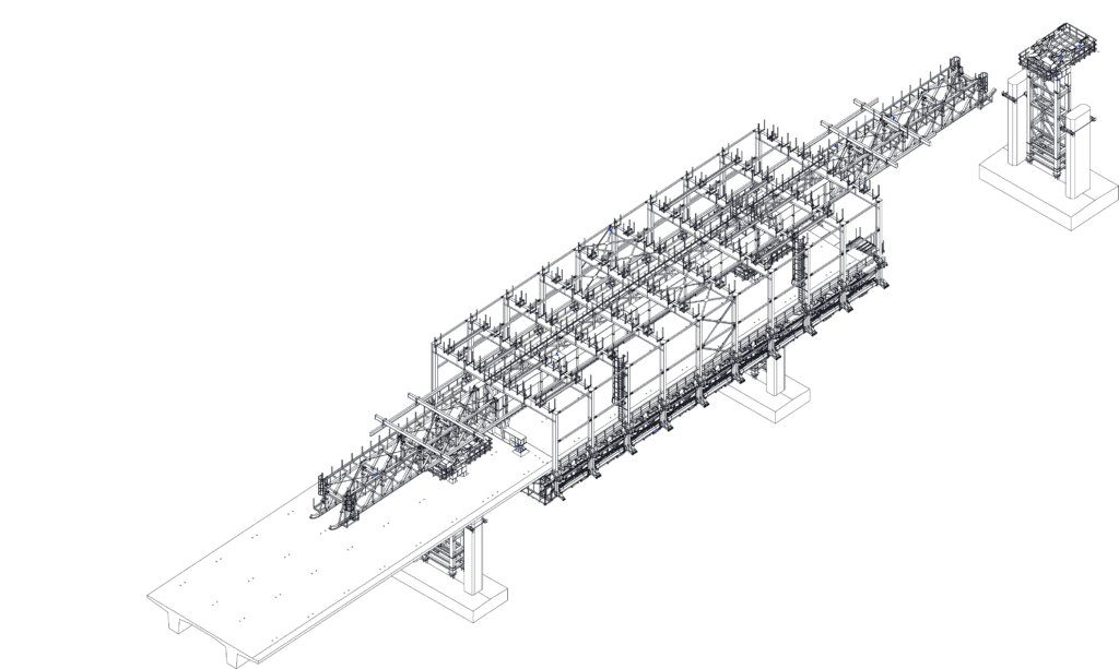 The Movable Scaffolding System was designed as an overhead type with two main I beams. Opening of the formwork and launching the MSS is was ensured by hydraulic cylinders.
