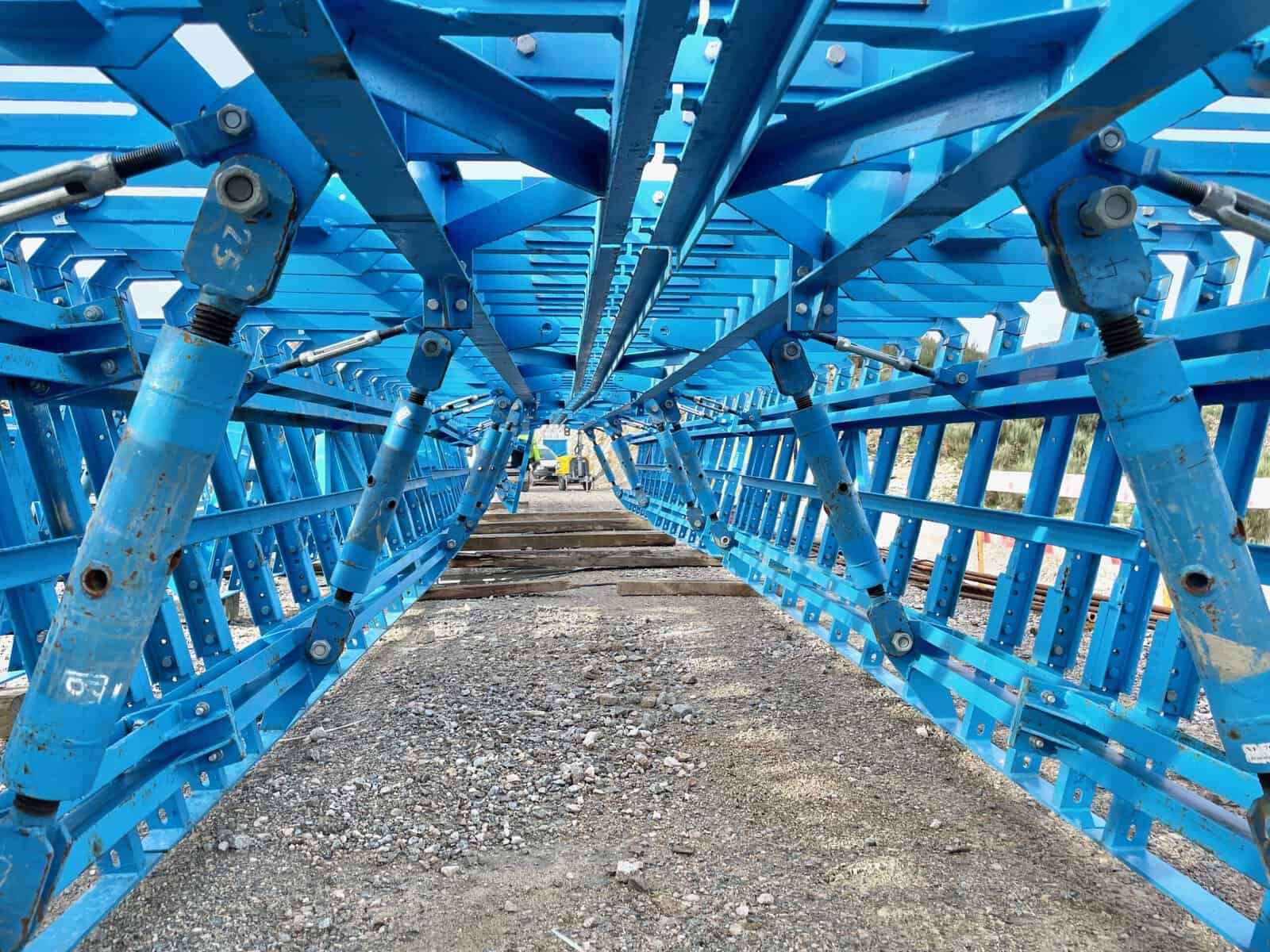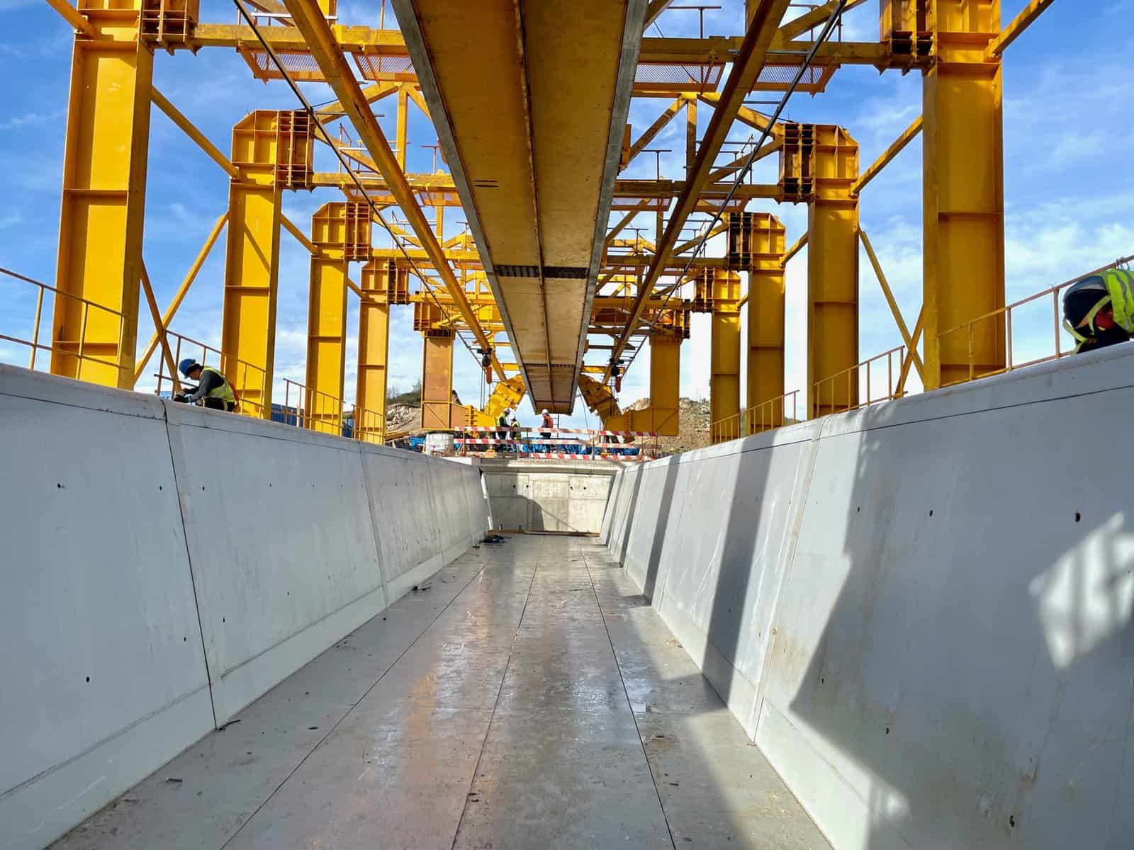 Strukturas’ redesign introduced significant modifications to the MSS, including a hinge joint between the main girder and the front nose, allowing it to be used on plan view curved decks, the addition of a rear concreting support, which allows for the transportation of pre-assembled U-shaped reinforcement using electrical winches, and the supply of a hydraulically operated internal formwork.